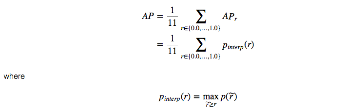 First, we divide the recall value from 0 to 1.0 into 11 points — 0, 0.1, 0.2, …, 0.9 and 1.0. Next, we compute the average of maximum precision value for these 11 recall values.
