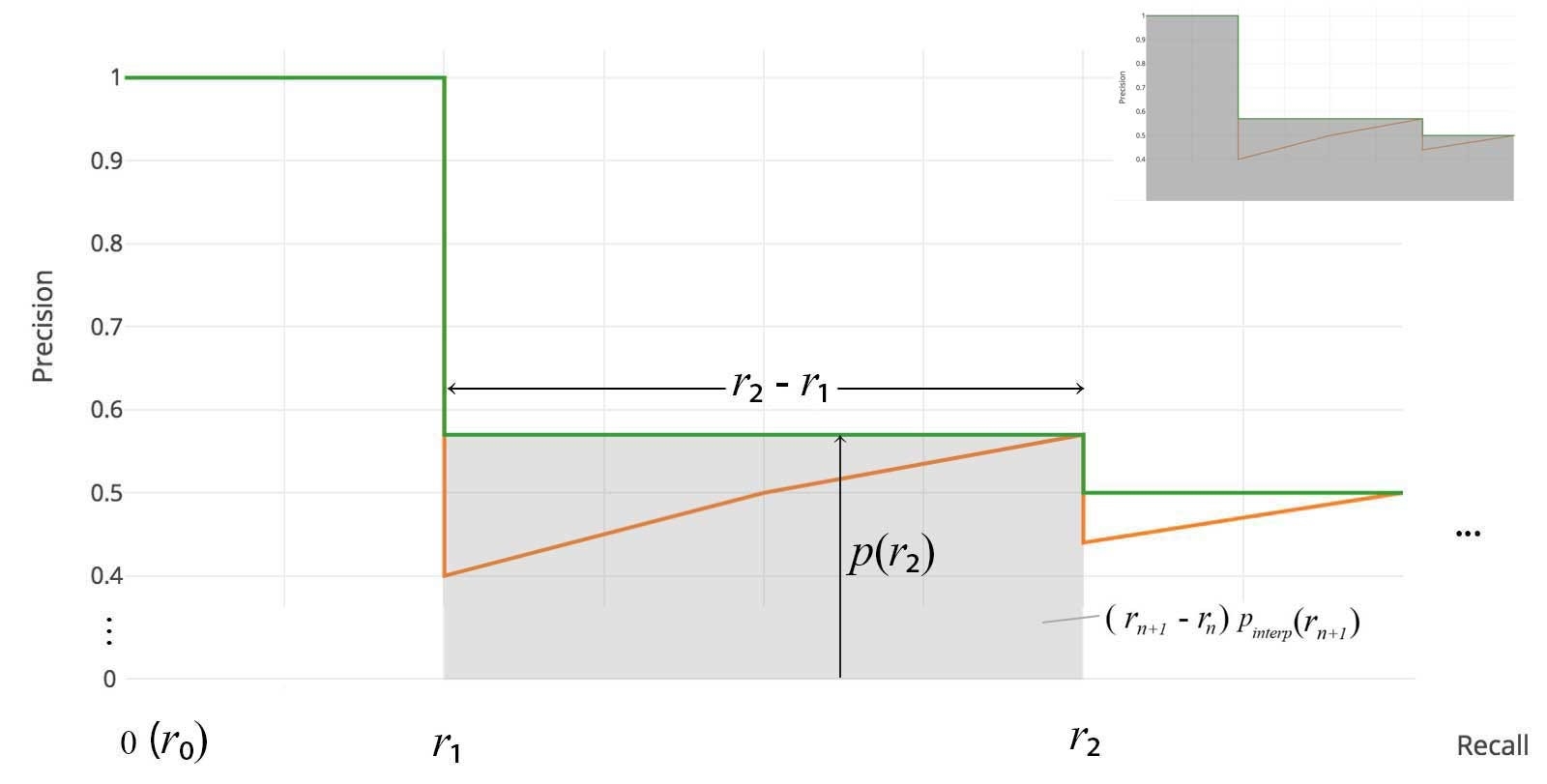 No approximation or interpolation is needed. Instead of sampling 11 points, we sample p(rᵢ) whenever it drops and computes AP as the sum of the rectangular blocks.