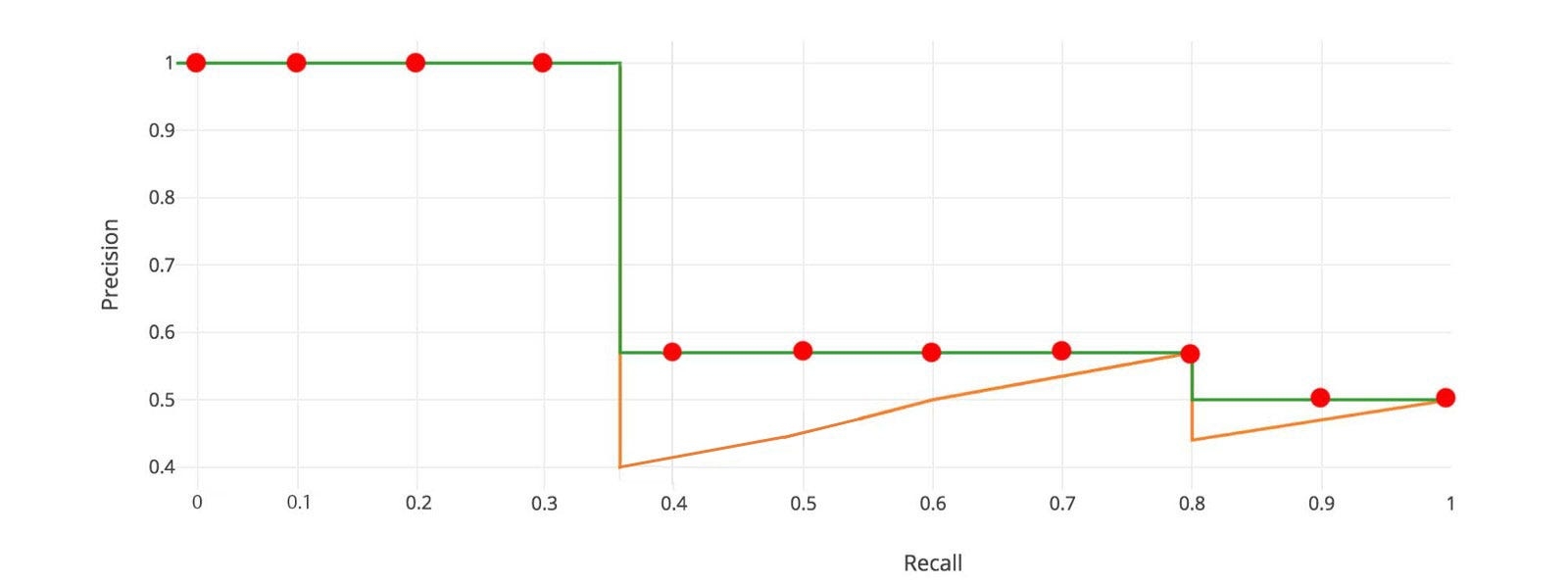 This definition is called the Area Under Curve (AUC). As shown below, as the interpolated points do not cover where the precision drops, both methods will diverge.