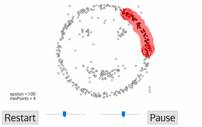 Once we’re done with the current cluster, a new unvisited point is retrieved and processed, leading to the discovery of a further cluster or noise. This process repeats until all points are marked as visited. Since at the end of this all points have been visited, each point will have been marked as either belonging to a cluster or being noise.