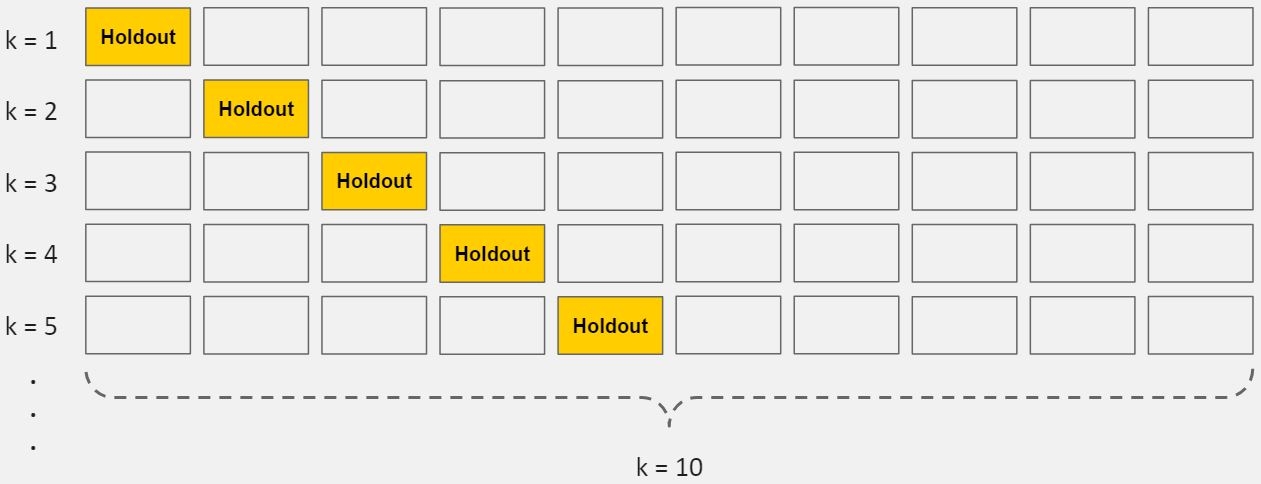 In standard k-fold cross-validation, we partition the data into k subsets, called folds. Then, we iteratively train the algorithm on k-1 folds while using the remaining fold as the test set (called the "holdout fold").
